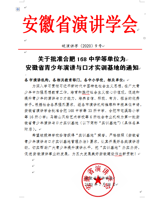 关于批准合肥168中学等单位为 安徽省青少年演讲与口才实训基地的通知