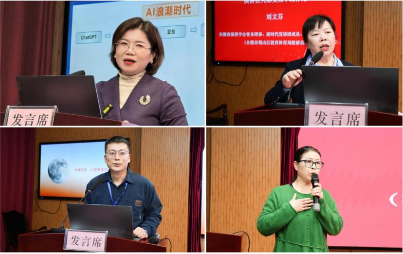 主题发言环节,10位嘉宾做精彩发言,内容精彩纷呈。省演讲学会学术委员会委员、安徽财经大学文学院副教授陈静宇聚焦《人工智能时代大学生演讲的思政培育与素养发展》,提出AI时代需将思政教育融入演讲教学,兼顾技术赋能与价值引领;省演讲学会理事、学术委员会委员、合肥市蜀山区教体局教研员刘文芬从人际交往视角,剖析演讲在搭建沟通桥梁、化解矛盾中的实践价值;六安市演讲与朗诵学会法人、六安市新闻传媒中心主持人吴声以《守正创新 融合发展》为题,分享新媒体环境下演讲的形态革新与传播技巧,倡导运用全媒体手段增强表达感染力。省演讲学会会员、淮南市明德小学教师刘本俊以乡村教育实践为蓝本,讲述《讲好安徽故事——乡村教师的骄傲》,展现基层教育者用创新表达润饰童心的责任担当;省演讲学会会员、六安市新闻传播中心李胜男聚焦文旅融合,探讨演讲在提升安徽形象、推广文旅资源中的应用路径,提出要让演讲成为地域文化的“流动名片”。