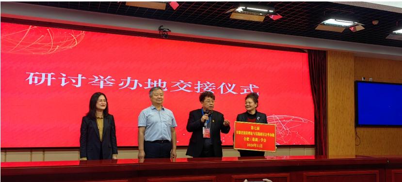 随后举行的承办交接仪式上,巢湖市演讲朗诵学会长许瑞杰从淮南市演讲学会会长庞秀艳手中接过承办旗,标志着第七届研讨会的筹备工作正式启动。