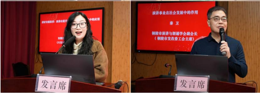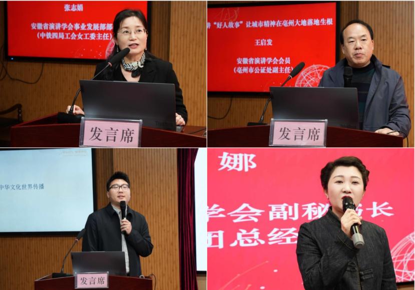 省演讲学会常务理事、铜陵市发改委工会主席秦卫阐释演讲事业对凝聚社会合力、推动社会发展的重要作用;省演讲学会事业发展部部长中铁四局工会女工委主任张志娟分享《与职工谈心谈话中的演讲技巧》,为职场沟通提供实用方法;省演讲学会会员、亳州市公证处副主任王启发介绍宣讲“好人故事”、培育城市精神的亳州实践;省演讲学会会员、新航道合肥学校市场总监但德宇提出以英语为桥梁,用国际语言传播安徽文化之美;省演讲学会副秘书长何娜以《从回声到心声》为题,分享演讲者与听众的情感共鸣之道。本环节由省演讲学会副会长张小平主持。